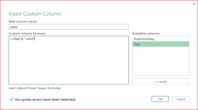 The date is still missing the year part. To get around this create a custom column. Power Query allows you to create custom column from existing columns. Go to Transform and click Insert Custom Column (Screen Capture 6)