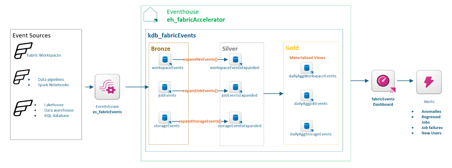 - Finally, Kusto Materialized Views are used to obtain daily snapshots of events data from the silver tables. These dailyAgg views form the gold layer for reporting and alerts.